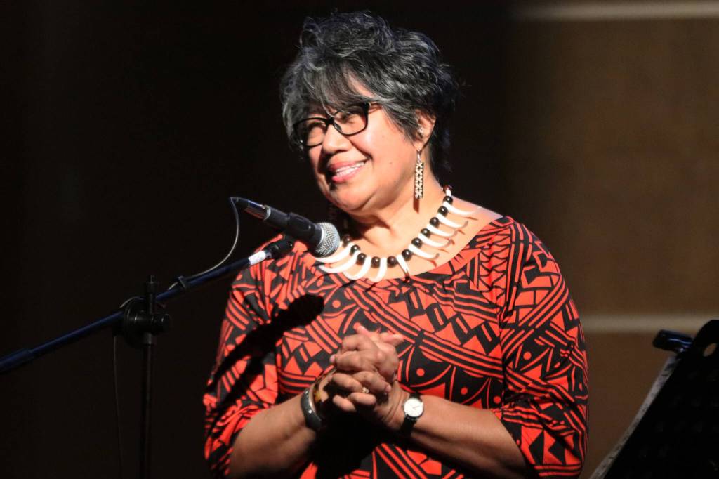 Misuli Smythe tells a personal story about her sister Tuesday night at Ḵunéix̱ Hídi Northern Light United Church as part of Mudrooms season finale. (Jonson Kuhn / Juneau Empire)