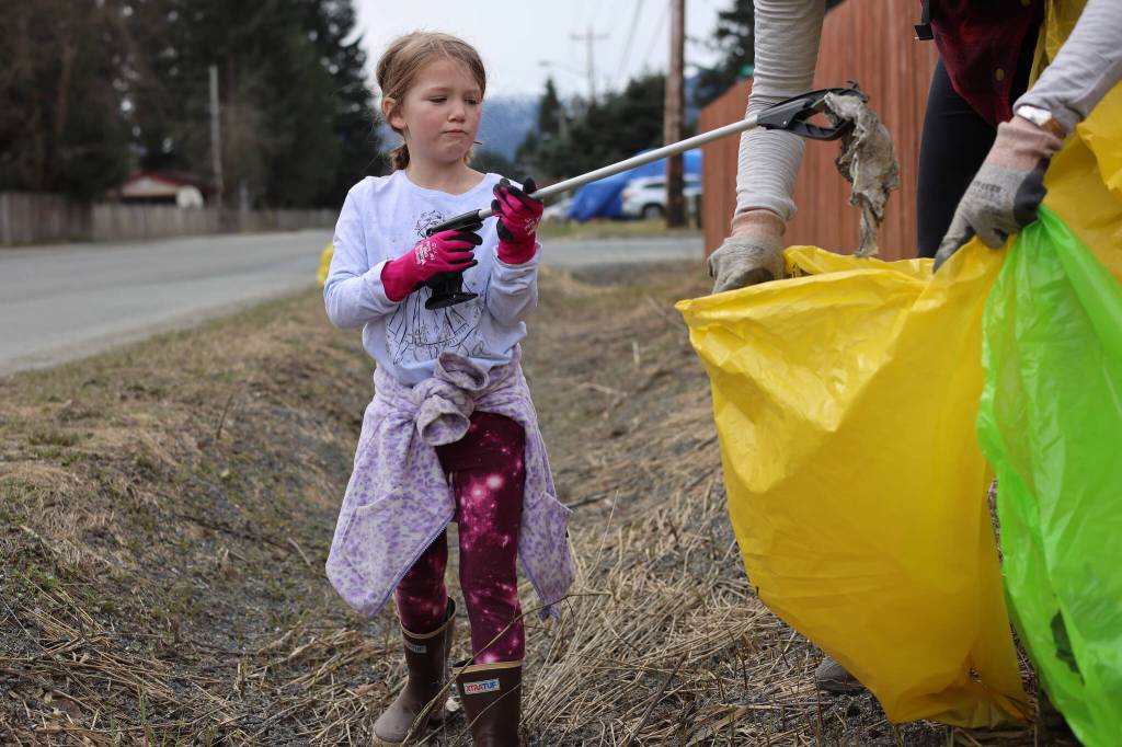 Berry was among the dozens of people picking up bags Saturday morning at Duck Creek Market ahead of the Earth Day cleanup of public lands in Juneau. About an hour later, she was joined by family —including her daughters, 6-year-old Catherine Berry and 3-year-old Genevieve Berry —in picking up trash in their Mendenhall Valley neighborhood.