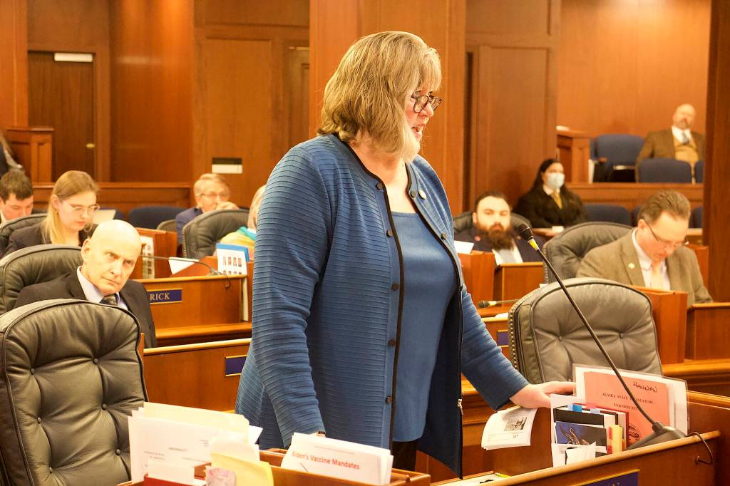 Rep. Sara Hannan, D-Juneau, speaks in opposition Wednesday to a bill prohibiting limits on firearms during emergencies, saying it could put people in shelters and the facilities at risk. (Mark Sabbatini / Juneau Empire)
