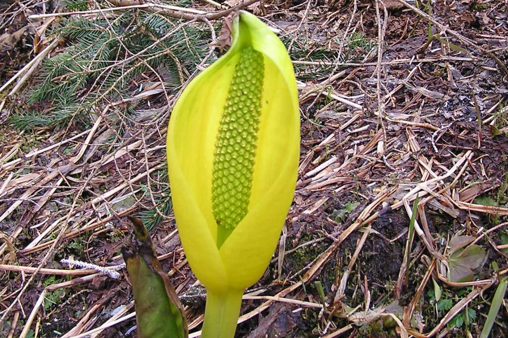 One of my favorite things in spring is watching the skunk cabbage plants. First, the little green spears emerge from the shallow waters, but I impatiently await the cheery, brilliant yellow spathes that announce the flowers of ‘swamp lanterns’. The hood-like yellow spathe (if not nipped off by frost or deer) surrounds the spike (or spadix) of densely packed flowers. Each of those flowers is female first—with pointy little stigmas sticking out for potential pollen reception. But the earliest plants to bloom, being all female, have no source of pollen, unless they can somehow pollinate themselves, as the flowers mature into the male phase. Eventually, all the flowers become male, producing yellow pollen. Now we begin to see insects hiding down deep in the spathe, sometimes tiny flies and dozens of black beetles. The beetles are thought to be pollinators, crawling over the male flowers, eating pollen and getting it all over their bodies, then carrying the pollen to later-blooming individuals, still in female phase. We never see as many beetles hiding in spathes around female-phase flowers as in spathes with male-phase flowers. And female-phase individuals often have no beetles at all, so it seems that beetle visits to females are intermittent, and I suspect that females send out air-borne messages that attract the beetles just when the time is right for pollination.