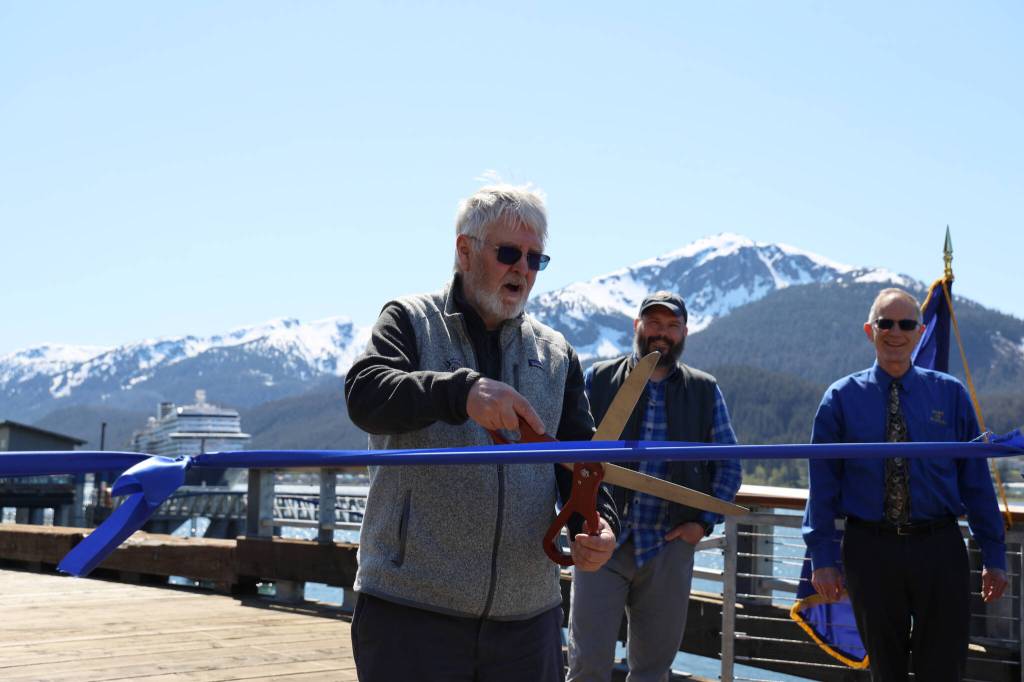 City and Borough of Juneau Docks and Harbors board vice chairman Jim Becker cuts a ribbon Monday afternoon stretched across the Seawalk downtown in celebration of the city’s completion of the Docks and Harbors Marine Deckover Project. (Clarise Larson / Juneau Empire)