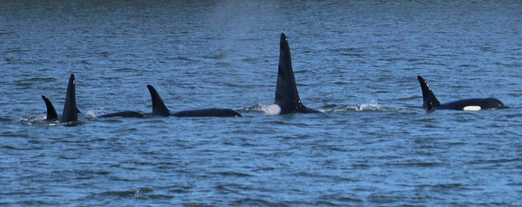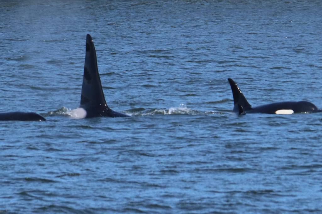 The highlight of our Berners Bay cruise with Audubon was sighting a pod of orcas, calmly swimming back and forth close to a gravelly beach. There were perhaps five or six individuals in the group: a male with a tall dorsal fin, probably an adult son of another sizable individual (presumably the mother), and an assortment of smaller ones. Orcas live in matriarchal groups: a female with one or more generations of offspring. An old female, past producing babies herself, often stays with her family group, and research on orcas in Puget Sound has shown that these grandmothers are very useful. They lead the others to good hunting areas, help the others hunt, and sometimes even share fish; in some cases, a grandmother tends a young one while its mother is off hunting. The ‘grandmother effect’ improves the survival of the young ones.