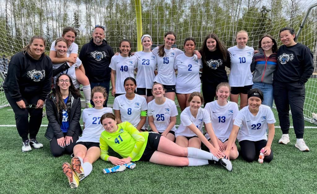 The Thunder Mountain High School Lady Falcons soccer team pose for a photo at Redington High School in Wasilla. The Lady Falcons defeated the Huskies 8-0 for their final game of the season. (Courtesy Photo)