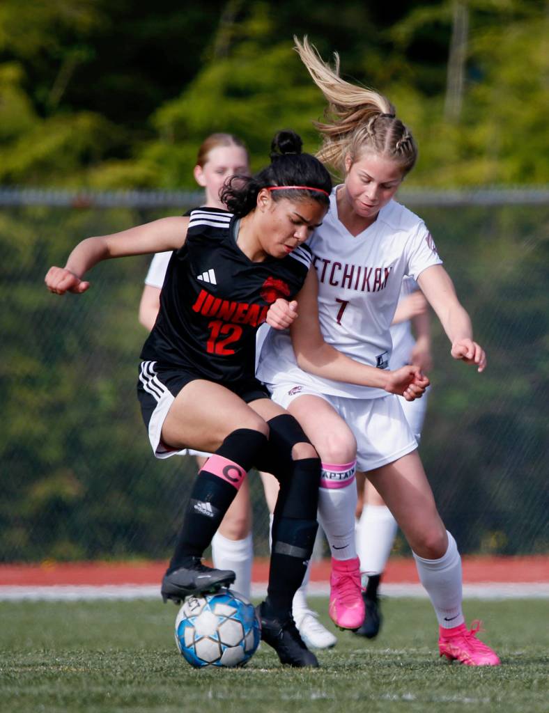 In this May 19 photo, Juneau Douglas’s Cadence Plummer (12) and Kayhi’s Aspen Bauer (7) battle for the ball during Juneau-Douglas and Kayhi’s 1-1 tie at Fawn Mountain. Photo by Christopher Mullen Ketchikan Daily News