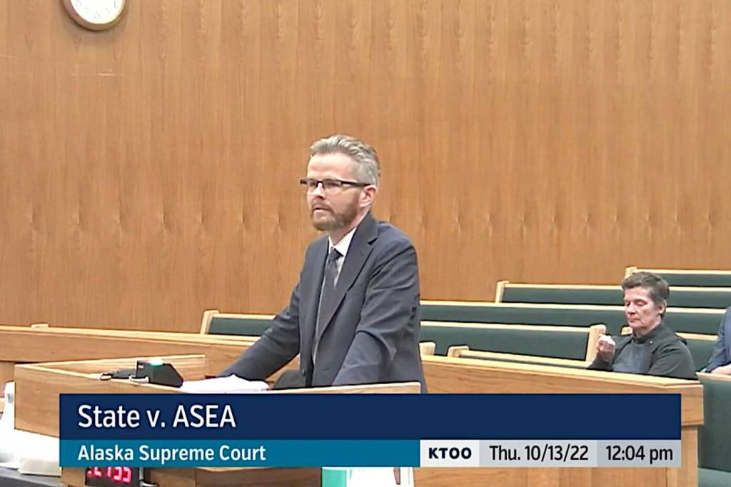 Matthew Murray, an attorney representing the Alaska State Employees Association, presents the union’s arguments in its lawsuit against the Dunleavy administration to the Alaska Supreme Court on Oct. 13, 2022. (Screenshot from Gavel Alaska livestream)