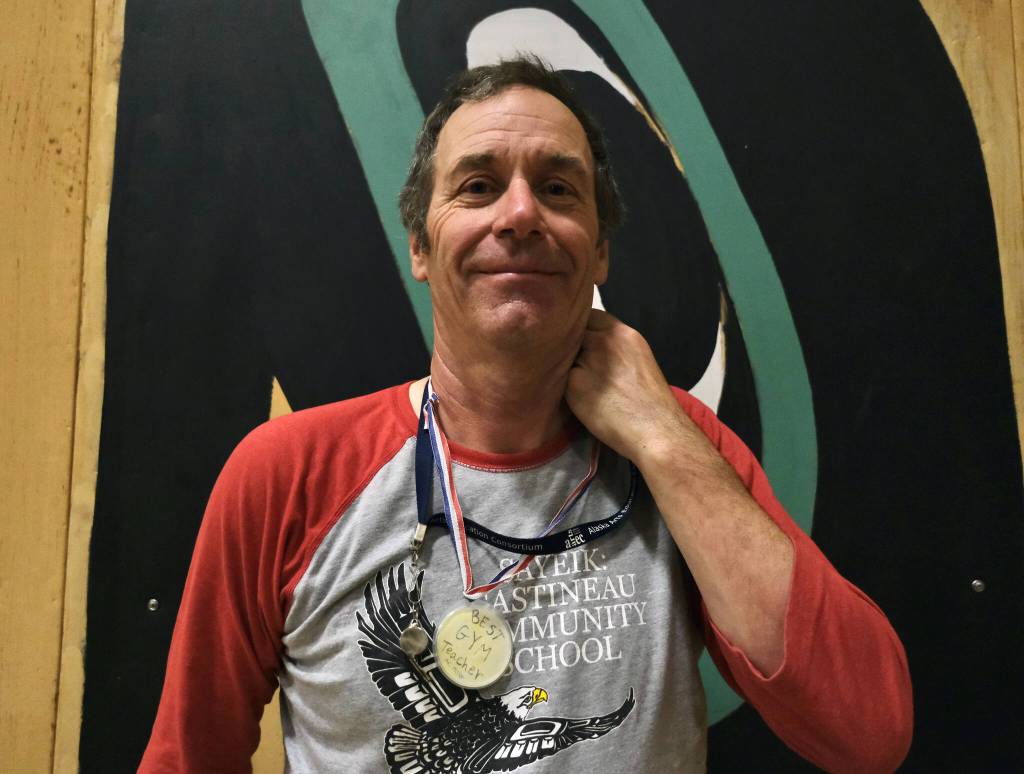 Sayéik: Gastineau Community School physical education teacher Dirk Miller displays one of his favorite awards on Thursday, a medal made by a student. Miller is retiring after 24 years at the school. (Klas Stolpe / Juneau Empire)