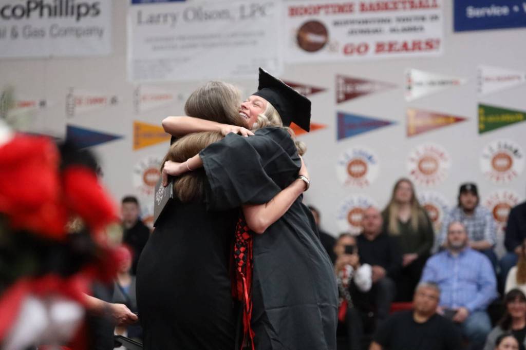 Revisiting the past was also a theme of the keynote speech by Juneau School District Superintendent Bridget Weiss, who is departing after a 40-year career as an educator. Born and raised in Juneau, she wore her 1980 JDHS Crimson Bears jacket as she talked about other family members who’ve been at past graduations, and the quirky mix of differences and similarities at the school during the many decades she has been a part of it.