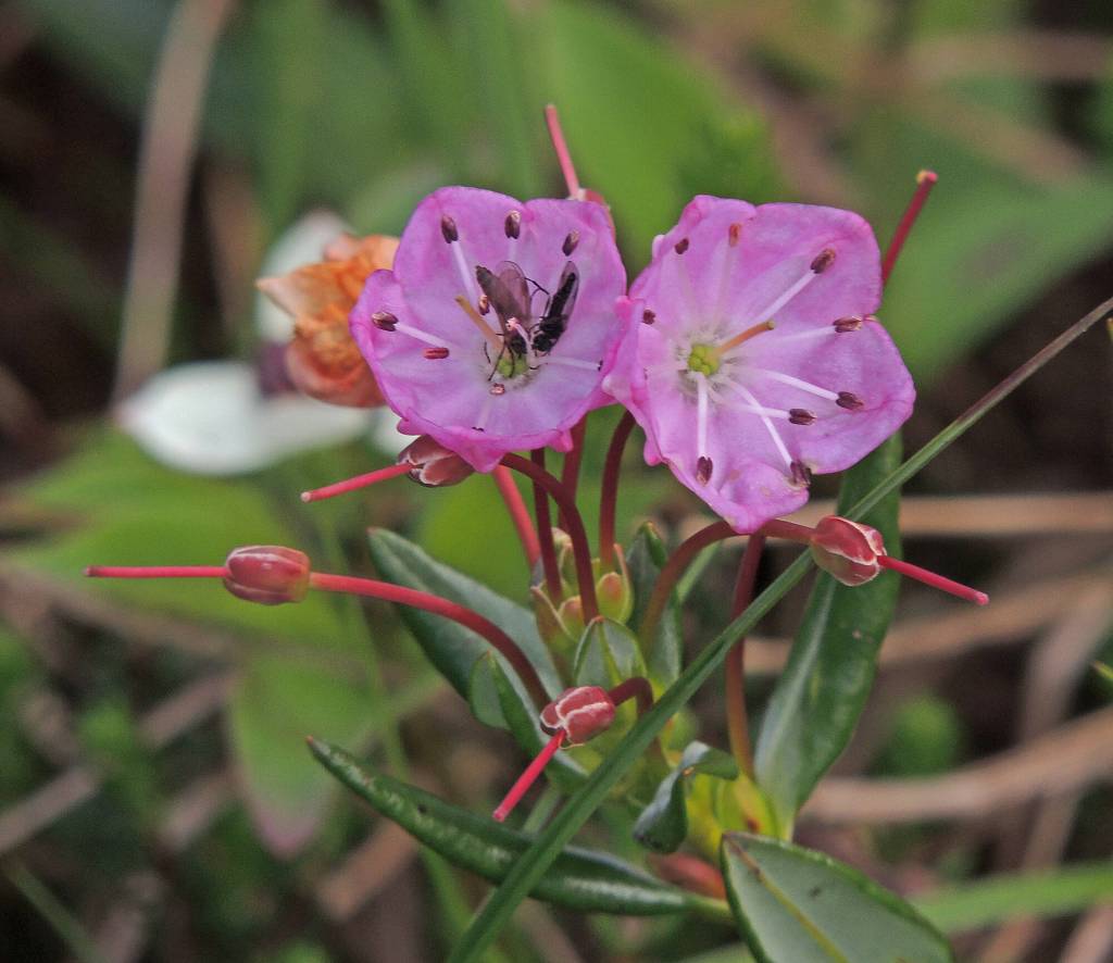 Herbaceous species were flowering as well, including two kinds of violets. A stroll through some muskegs on North Douglas found thousands of cloudberry flowers, almost making a white carpet with the help of trailing raspberry. Dwarf dogwood flowers were open, the surrounding bracts just turning white and enlarging. The first bog laurels were opening their sharply pleated buds, exposing the stamens lying flat against the young petals. When the petals mature and spread, visiting insects searching for nectar disturb the bases of the stamens; this activity springs loose the pollen-bearing anthers from the little pocket where they were held. As the anthers pop out they release small clouds of pollen, which can be collected by bees or get stuck on insect exteriors and carried to another flower. The yellow flowers of villous cinquefoil decorated a big rocky outcrop just above the high tide line; the mature, flowering individuals were surrounded by scattered small juvenile plants — evidence of previous years’ successful seed production.