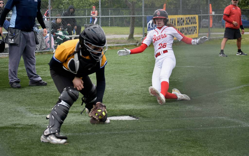 The Juneau-Douglas High School: Yadaa.at Kalé Crimson Bears softball team opened the ASAA Division II State Softball Championships with a 9-1 win over Kodiak and a 5-3 loss to North Pole on Thursday at Anchorage’s Cartee Fields.