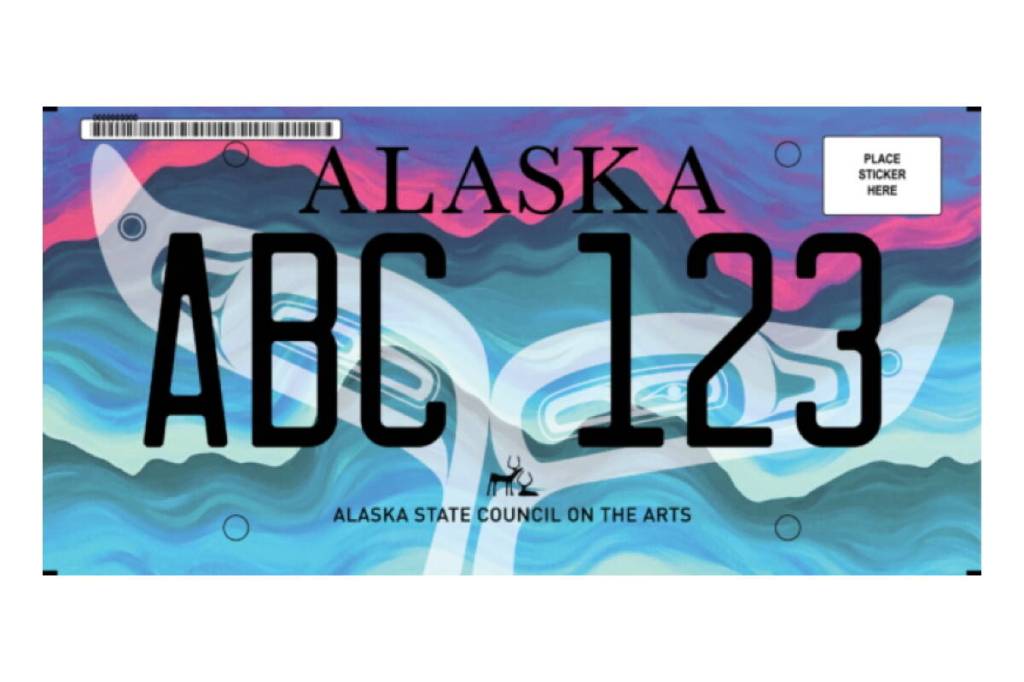A “Whale’s Tail” license plate by Juneau artist Crystal Worl is among six semi-finalists in a statewide contest open to public voting until July 31. The winner will be announced Aug. 26 at the Alaska State Fair in Palmer and available afterward for purchase at DMVs statewide through 2027. (Courtesy Photo / Alaska State Council on the Arts)