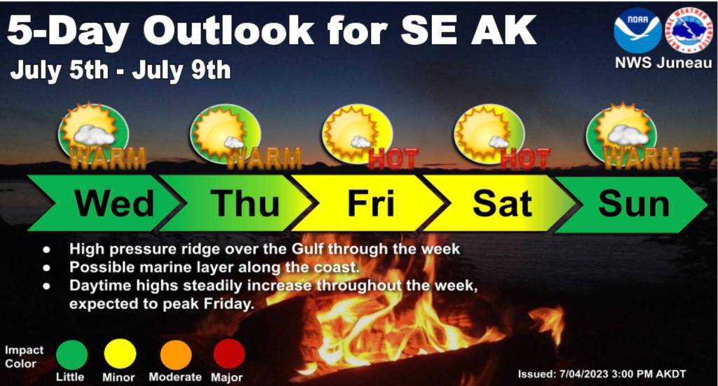 “We’re looking at 80 degrees, mid 80s, and then cooling back through the weekend,” Caleb Cravens, a meteorologist for the weather service in Juneau, said Wednesday.