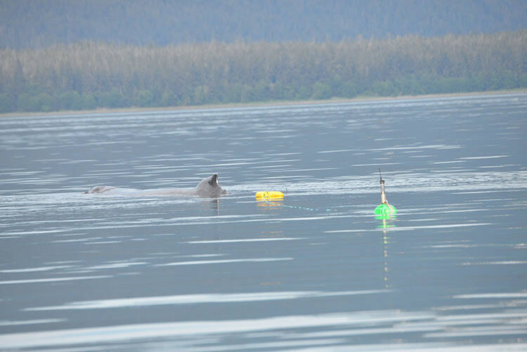 The first whale entangled is named “Manunauna” and is well known to the Juneau area — often seen feeding on herring near Statter Harbor and lunge feeding in Fritz Cove. On Monday morning it was reported the whale appeared to be ensnared in a Dungeness crab pot line near the North Douglas boat ramp.