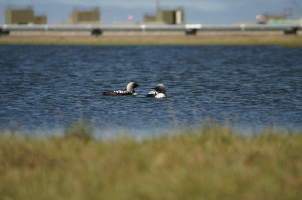 Loons swim near a pipeline and other oil field infrastructure at the Greater Prudhoe Bay Unit on Alaska’s North Slope in this undated photo. A new study finds that nest survival is lower for birds closer to high-use infrastructure. (Photo by Kayla Scheimreif/Wildlife Conservation Society)