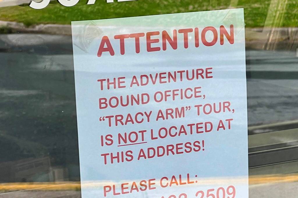 The Adventure Bound Alaska website lists an address on Egan Street in front of docks. Enough people come to the storefront of nearby UnCruise Adventures that a sign, with phone number to reach the other company, has been posted on the front doors: “ATTENTION: THE ADVENTURE BOUND ‘TRACY ARM’ TOUR IS NOT LOCATED AT THIS ADDRESS!”
