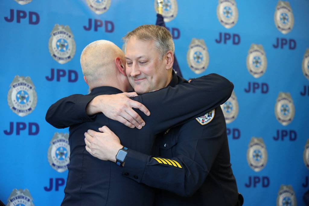 Retiring Juneau Chief of Police Ed Mercer (left) and City Manager Rorie Watt (right) hug during Mercer’s retirement ceremony Friday afternoon at the Juneau Police Department station. (Clarise Larson / Juneau Empire)