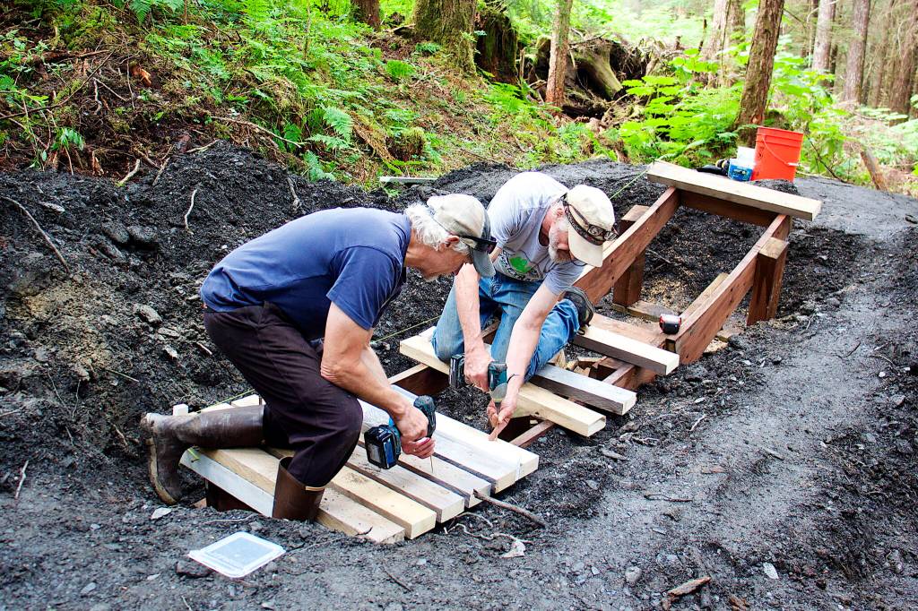 Materials have come from multiple public and private sources, including wood donated by Juneau’s municipal government and a company in Hoonah, Harris said. The city also provided an excavator to help remove the most difficult obstacles such as stumps and roots of fallen trees, although an effort was made to preserve trees still living.