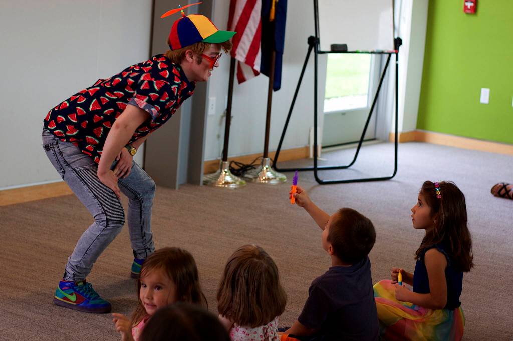 Evan Handsome, a Juneau Drag performer, shares noisemakers with kids during a Drag Storytime at the Mendenhall Valley Public Library Saturday, Aug. 5. (Mark Sabbatini / Juneau Empire)
