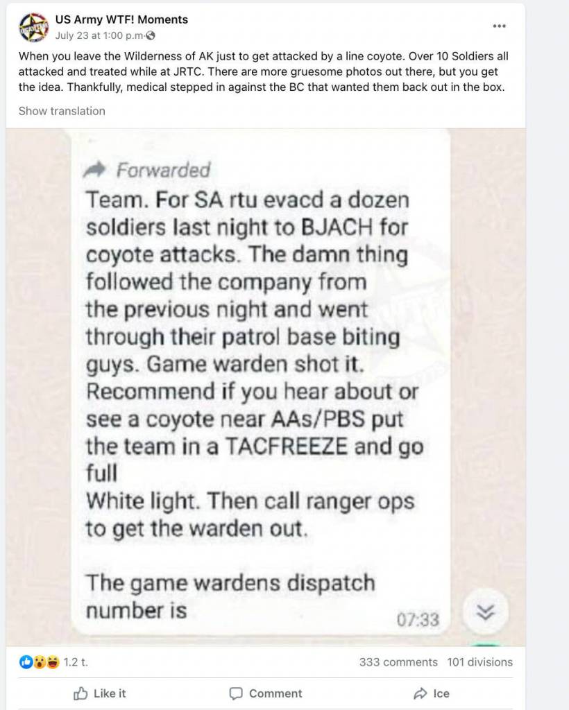 A popular social media account, “U.S Army WTF! moments,” posted about the incident, quipping: “When you leave the wilderness of AK just to get attacked by a…coyote.” The post drew numerous comments critiquing the military for leaving the soldiers without ammunition, along with a response: “Mixing live and blanks gets troops killed.”
