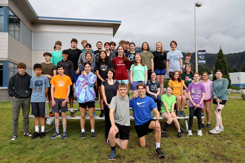 The Thunder Mountain High School cross-country team pose for a photo before their practice began outside of the high school Thursday evening. (Clarise Larson / Juneau Empire)