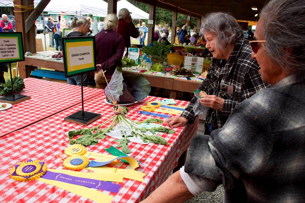 Doreen Prieto and Bobbi Mitchell examine an “octopus on the hook” root vegetable that was the youth grand prize winner at the 29th Annual Juneau Community Garden Harvest Fair on Saturday. (Mark Sabbatini / Juneau Empire)