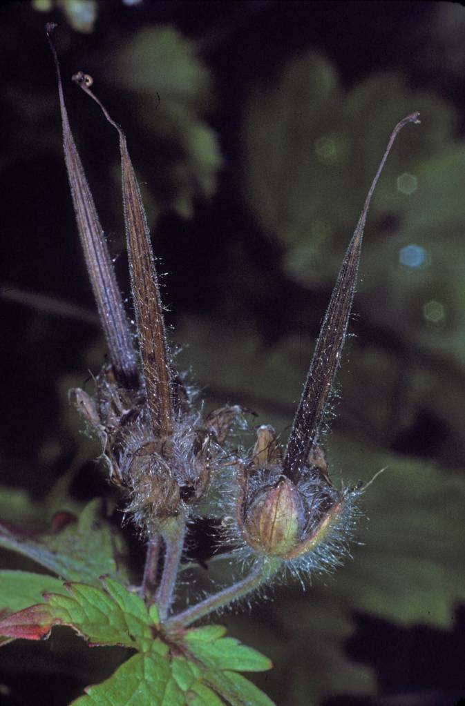 Although we couldn’t go very far up the trail beyond the cross, due to constraints of time and gimpy knees, we found several things of interest. Purple monkshood flowers thrived, but bees seemed to prefer other flowers to visit. Groundsels and paintbrush added touches of yellow. Miniature eyebrights were only big enough to produce one or two white flowers. Some of the frog orchids were still flowering, but others had finished. Valerian flowers had set seed and dispersed them, leaving behind the framework of little stems and pedicels that once supported them. That framework now held a collection of dazzling fog droplets that sparkled even in the mists. Northern geranium had been well pollinated and many flowers had produced the tall fruits that give this plant its alternative name of crane’s bill. That “bill” is a remarkable device for dispersing seeds: The tip of the bill is a hinge, linking five shafts that hold five seeds at the base of the bill. As the bill matures and dries, those hinged shafts spring wide, backhandedly catapulting the seeds away from the parent plant.