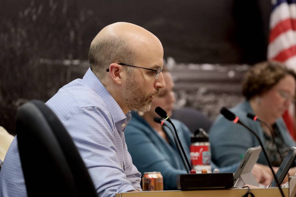 Deputy City Manager Robert Barr shares an update with the Assembly Monday evening following Resurrection Lutheran Church’s decision to not host the city’s cold weather emergency shelter this year. (Clarise Larson / Juneau Empire)