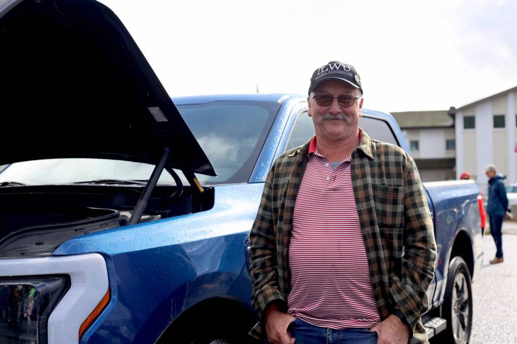 Juneau resident John Bush smiles for a picture next to his Ford F-150 Lightning at Juneau’s EV & E-bike Roundup downtown Saturday afternoon. (Clarise Larson / Juneau Empire)