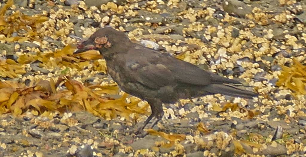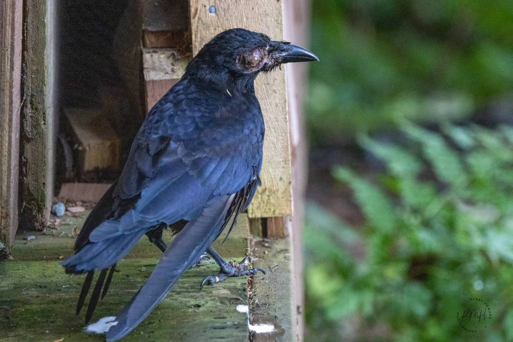 A raven has a serious case of avian pox on the face, blinding one eye. (Photo by Bob Armstrong)
