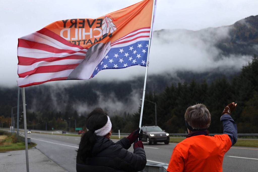 Jacobs said she didn’t mind and, alongside more than a dozen other Juneau residents who attended the third-annual Orange Shirt Day morning flag wave, she waved it proudly to cars passing by as the paint dripped down.