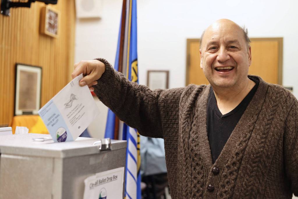 Juneau resident Michael Beasley stopped by the Assembly Chambers to cast his ballot early Tuesday morning. Beasley said he would be voting for the four candidates backed by campaign group Save Juneau and voting against the City Hall bond. He said he’d like to see new faces on the Assembly.