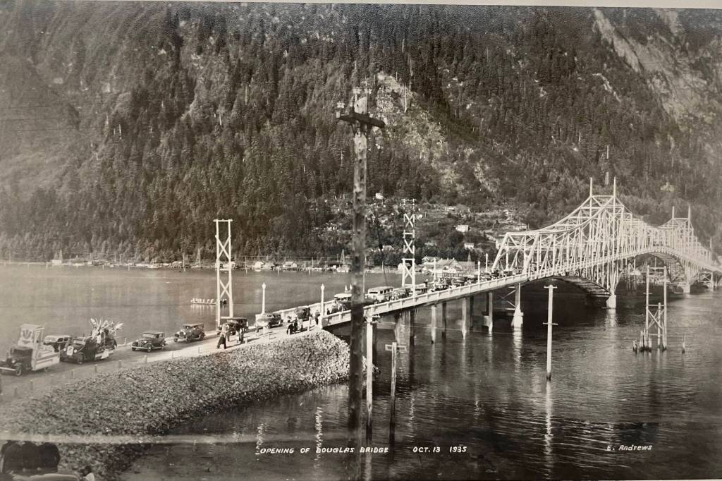 The cross-channel bridge construction project was incredibly efficient. From receiving the news of allocated funds in December 1933 to the grand dedication on Oct. 13, 1935, only 22 months had elapsed. In June of 1935 a news article celebrated the arrival of the final section of steel for the bridge. When it was hoisted into place the connection was only five-eighths of an inch off. Earlier a fleet of trucks had hauled waste rock from the Alaska Juneau Gold Mine’s rock dump to build the approaches under the guidance of R.J. Sommers.