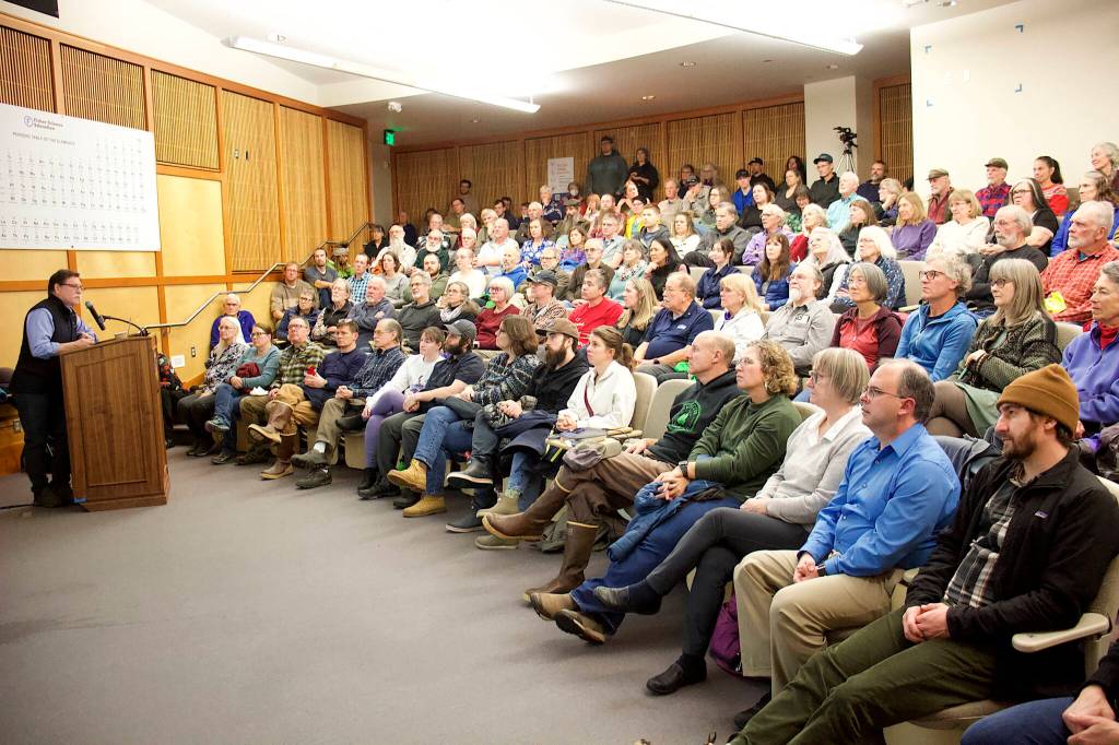 The crowd packed into the Egan Lecture Hall at UAS to hear Powell’s presentation, watch the documentary “Cruise Boom” about the industry’s impacts on Sitka in 2022 after COVID-19 restrictions were lifted, and participate in the Q&A — with many attendees making impassioned statements rather than asking questions.