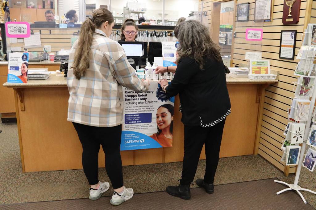 Cheyenne Latu (left), a pharmacy technician at Ron’s Apothecary Shoppe, and business co-owner Gretchen Watts hang a poster at the front counter Thursday announcing the store’s closure after Dec. 6 as Jessica Kirtley, another pharmacy technician, works at the front register. The nearby Safeway supermarket has agreed to take the prescriptions of all customers as well as hire all of the independent pharmacy’s employees, according to the co-owners who are retiring. (Mark Sabbatini / Juneau Empire)
