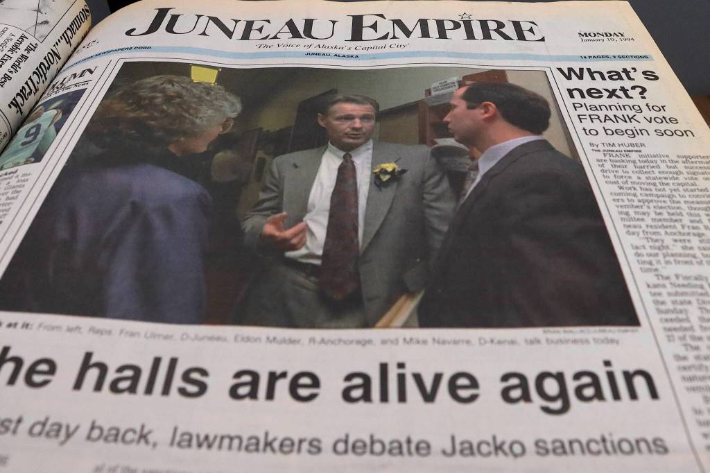 This week in 1994, FRANK initiative supporters are basking in the aftermath of their harried but successful drive to collect enough signatures to force a statewide vote on the cost of moving the capital. Work has not yet started on the coming campaign to convince voters to approve the measure in November’s election, though a meeting may be held this week, committee member and former Juneau resident Fran Rose said from Anchorage. The Fiscally Responsible Alaskans Needing Knowledge committee submitted 37,220 signatures to the state Division of Elections on Jan. 9. The committee far exceeded the 26,143 signatures needed from registered voters in 27 of the state’s 40 House districts. Another initiative already on the ballot would move the capital to Wasilla as of January 1997.