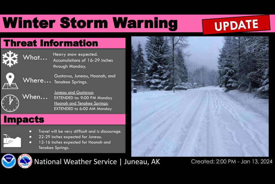 Some parts of Juneau have already received as much as 13 inches of snow as of 3:30 p.m. Saturday, although accumulation varies considerably by area, said Greg Spann, a meteorologist for NWS Juneau. While a storm warning on Saturday morning forecast heavy snow until 6 a.m. Sunday, the warning was extended during the afternoon to 9 p.m. Monday.