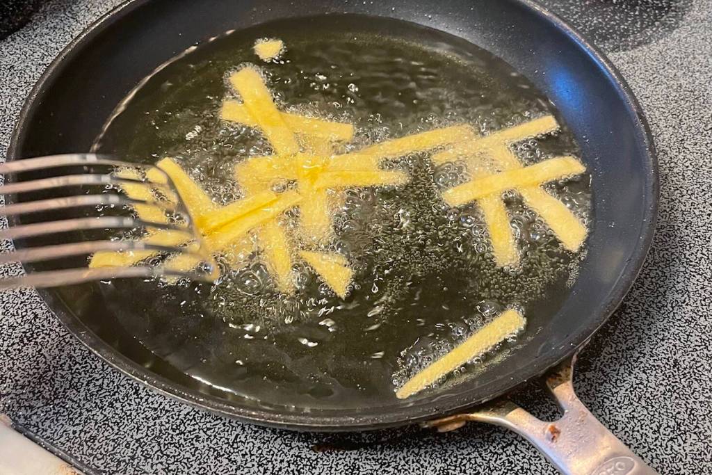 Fry tortilla strips in hot oil until golden (be careful not to brown). Drain on paper towels and salt. Place in large bowl on the table.