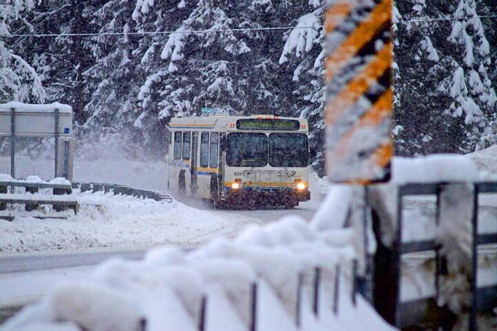 A Capital Transit bus navigates a plowed city street during this week’s storm. (City and Borough of Juneau photo)