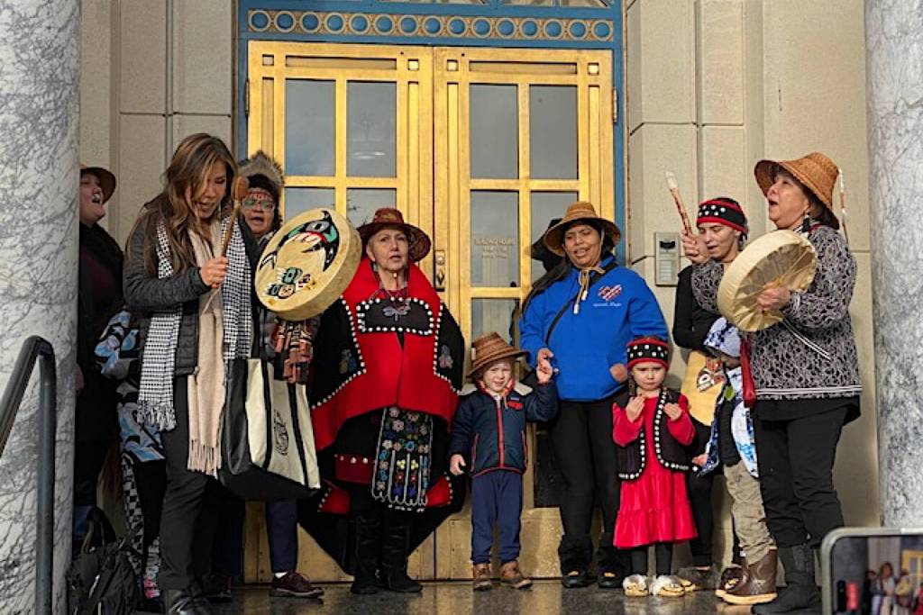 A dance group sings in a presentation by the Alaska Native Heritage Center and Native Movement at the state Capitol on Monday. (Photo by Claire Stremple/Alaska Beacon)