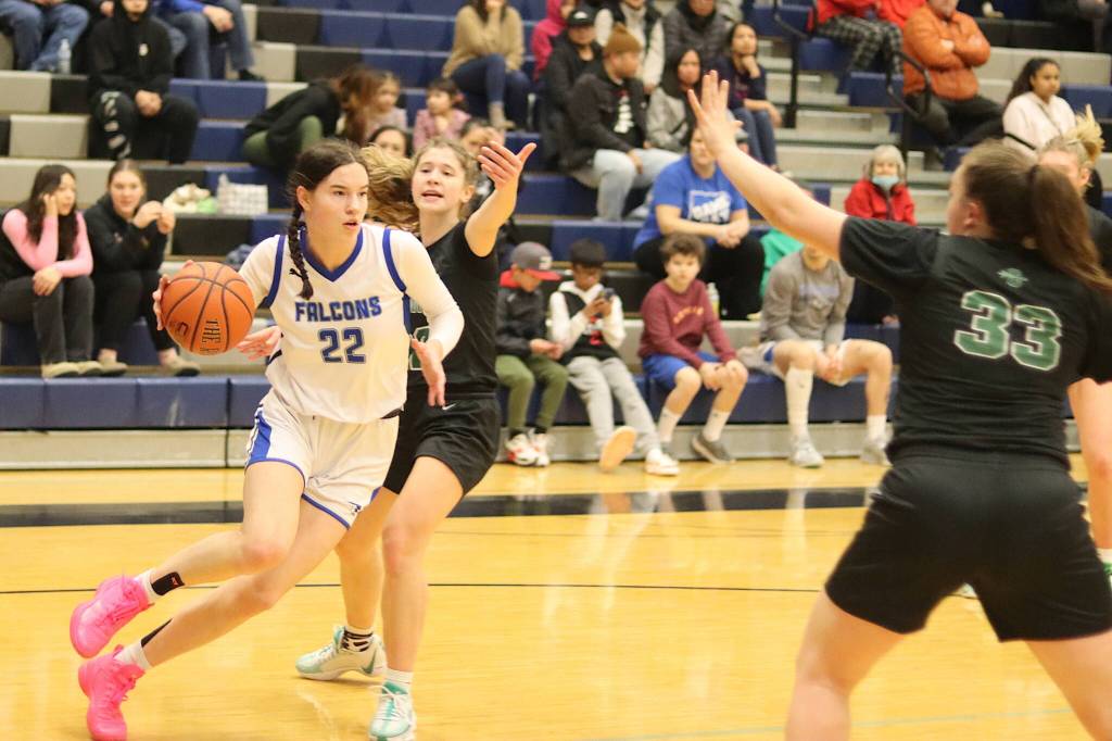 The Falcons were 15-1 overall and ranked fourth in 4A competition entering the pair of games, with their only loss coming against Juneau-Douglas High School: Yadaa.at Kalé (13-8 overall) on a last-second shot on Feb. 2. But a preview of the challenge TMHS was facing against Colony (now 20-2 overall) occurred on Thursday as the Knights soared to a 73-20 win over the Crimson Bears at JDHS, with an aggressive pressure defense leading to multiple turnovers and mistakes by the home team.
