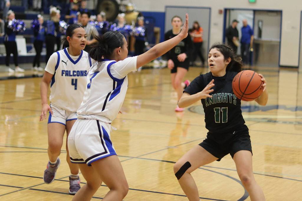 However, while the Falcons had the lead late in the third quarter they were also down several players — three due to illness and three injured during the game — and the Knights took advantage by hitting a series of open 3-point shots to open up a lead that ended in a 57-48 final score.