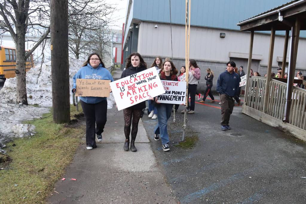 But the sophomore at Juneau-Douglas High School: Yadaa.at Kalé, standing along the side of Egan Drive on Tuesday afternoon with dozens of peers and teachers, said she wants residents — and policymakers — to be thinking about the opportunities that will be lost if facilities unique to her school are no longer available.