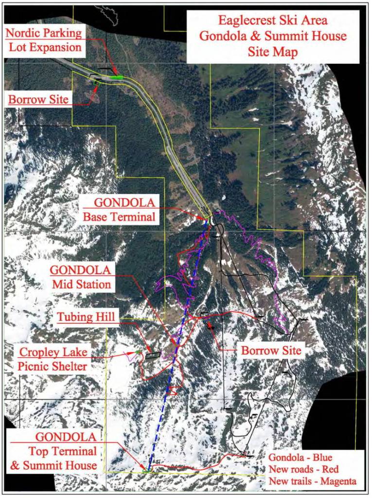 • Three new access roads for the construction of the gondola and Summit House lodge. While the roads will also be used for post-construction access and maintenance needs, “many of the gondola tower access trails and construction roads will be converted into mountain bike and hiking trails,” the project overview notes. “In addition, a new trail will be constructed that bisects the gondola line in as many locations as possible to provide a summer egress route if the gondola ever needs to be evacuated.”