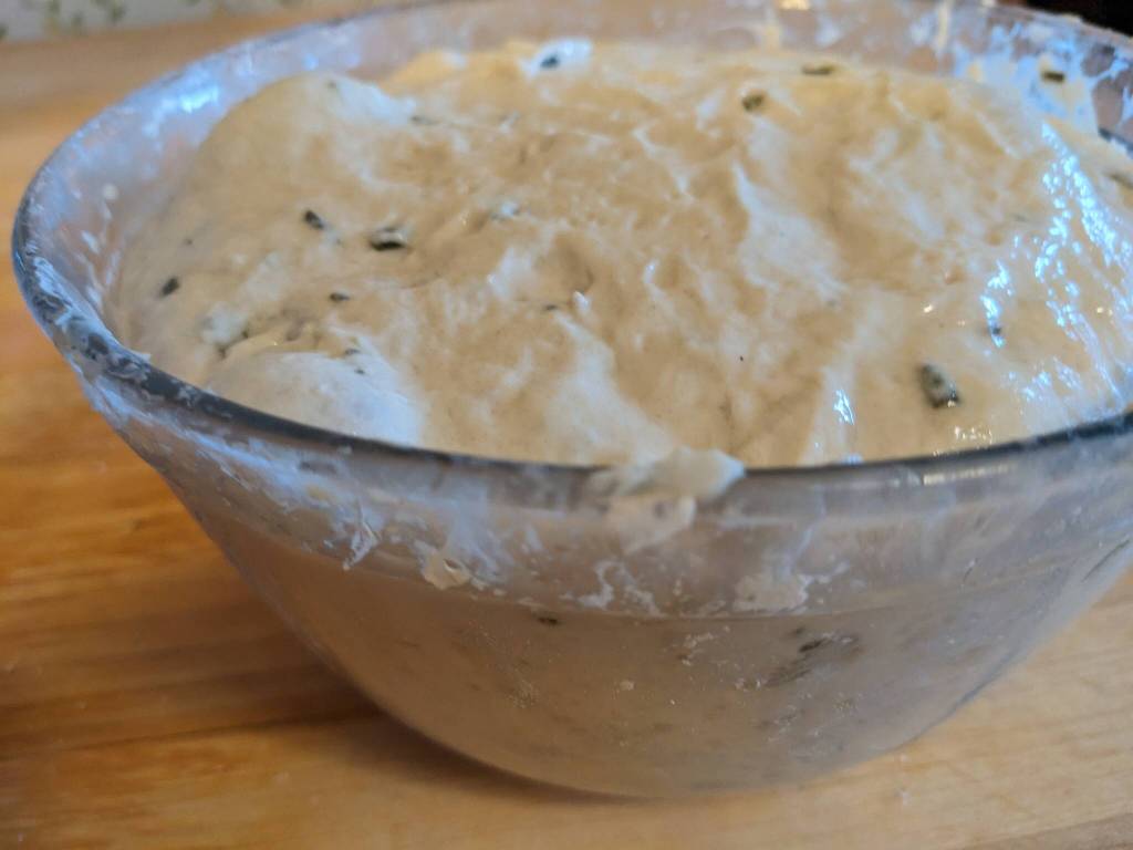 Add a cup of all-purpose flour and stir into the water. Then add one tablespoon of fresh minced rosemary (or a little more if you want). Mix to combine then add another cup of flour and stir again. Gradually add the remaining flour to make a slightly stiff batter making sure that all the flour is mixed in. At this point, the dough will look sloppy. Don’t worry about it. Cover it with plastic wrap and let it sit on your kitchen counter for 45 minutes.