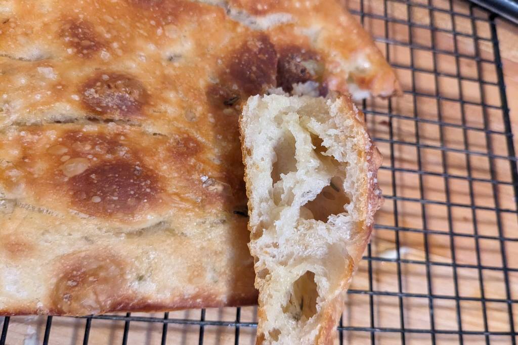 A loaf of rosemary focaccia bread fresh from the oven. (By Patty Schied)