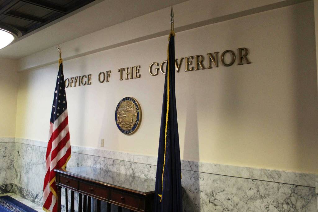 Flags flank the entrance to Gov. Mike Dunleavy’s office at the Alaska State Capitol on Thursday. (Ashlyn O’Hara/Peninsula Clarion)