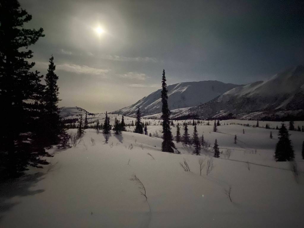 Peter Delamere captured this moonlight shot of the Alaska Range as he approached Rainy Pass by fat bike during the 2024 Iditarod Trail Invitational Race. (Photo by Peter Delamere)