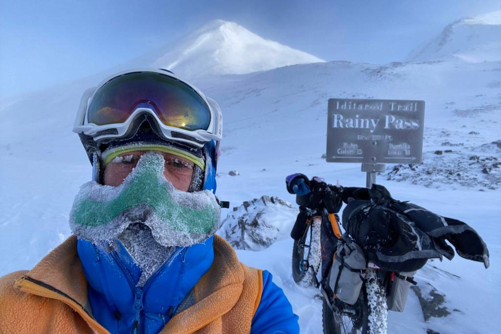Peter Delamere poses in front of a sign in Rainy Pass in the Alaska Range during the 2024 Iditarod Trail Invitational race. On his face is a “nose-hat” invented by Fairbanks athlete Shalane Frost. (Photo by Peter Delamere)