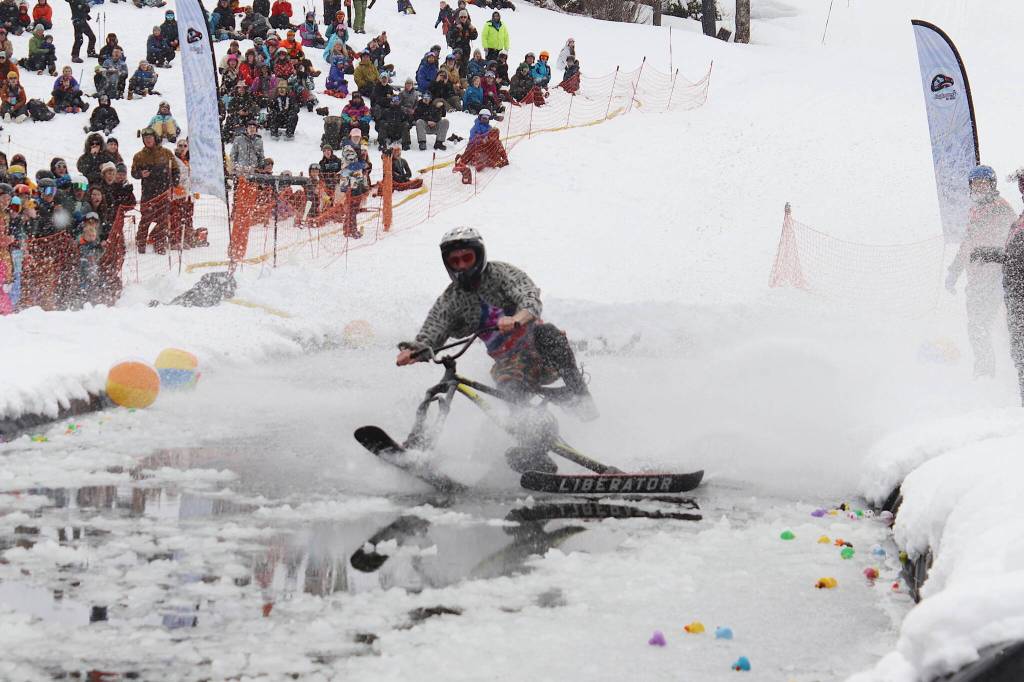 Ethan Welch tries to keep his Ski Bike upright while crossing the pond during the Slush Cup at Eaglecrest on Sunday. (Mark Sabbatini / Juneau Empire)