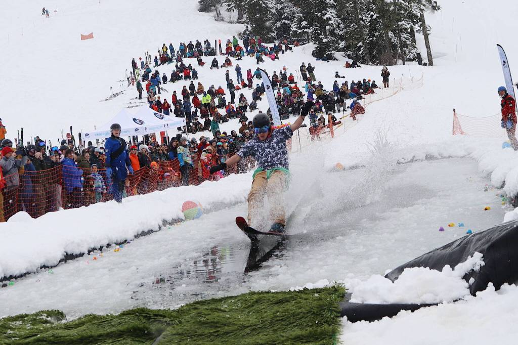 Jensen was among about 80 people ending the season at Eaglecrest Ski Area on Sunday in a daring and often drenching way, attempting to cross a 100-foot-long pond on skis, snowboards and at least one device firmly in the category of “other.” It was his second straight year of taking a full-body dunk in the icy pond, but said while still dripping wet after climbing out there was no hesitation about signing up again for the annual event.