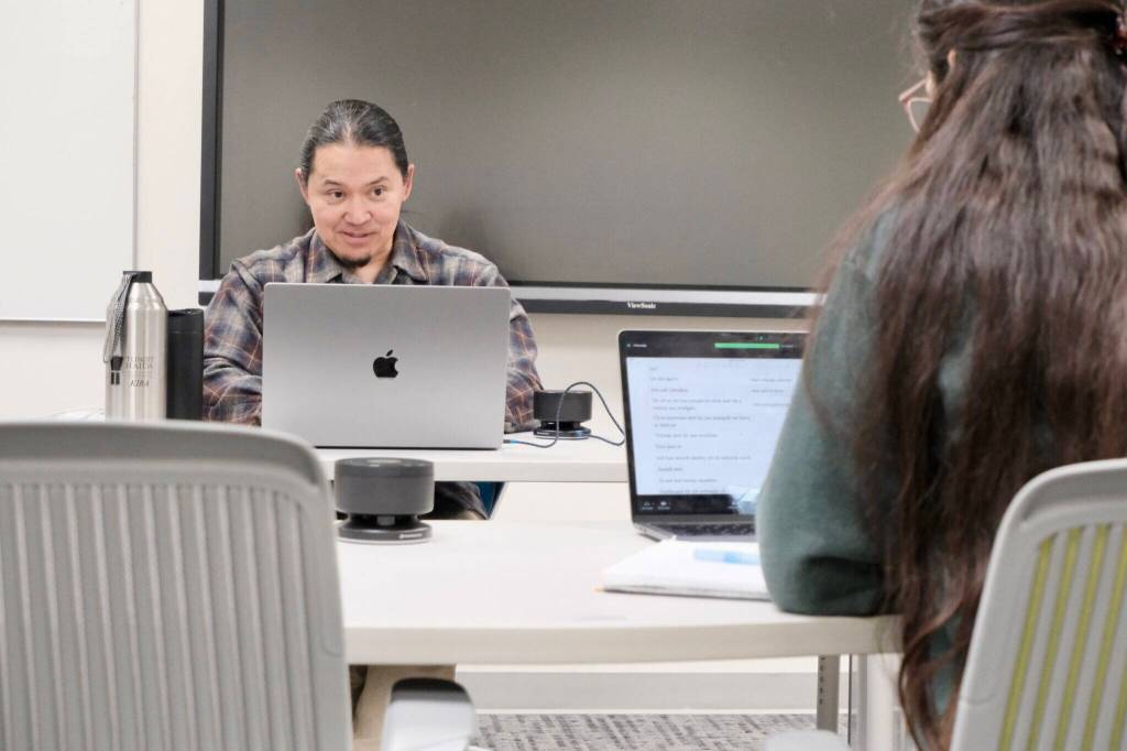 Professor X̱’unei Lance Twitchell walked in and suggested the specific verb for cooking meat by boiling. He answered a few questions in English, then switched to Tlingít as he started class. All his students switched languages, too. For the next hour, conversation was almost exclusively in the original language spoken primarily from the mouth of the Copper River to the southern edge of the Alexander Archipelago and the foundation for Tlingít cultural identity.